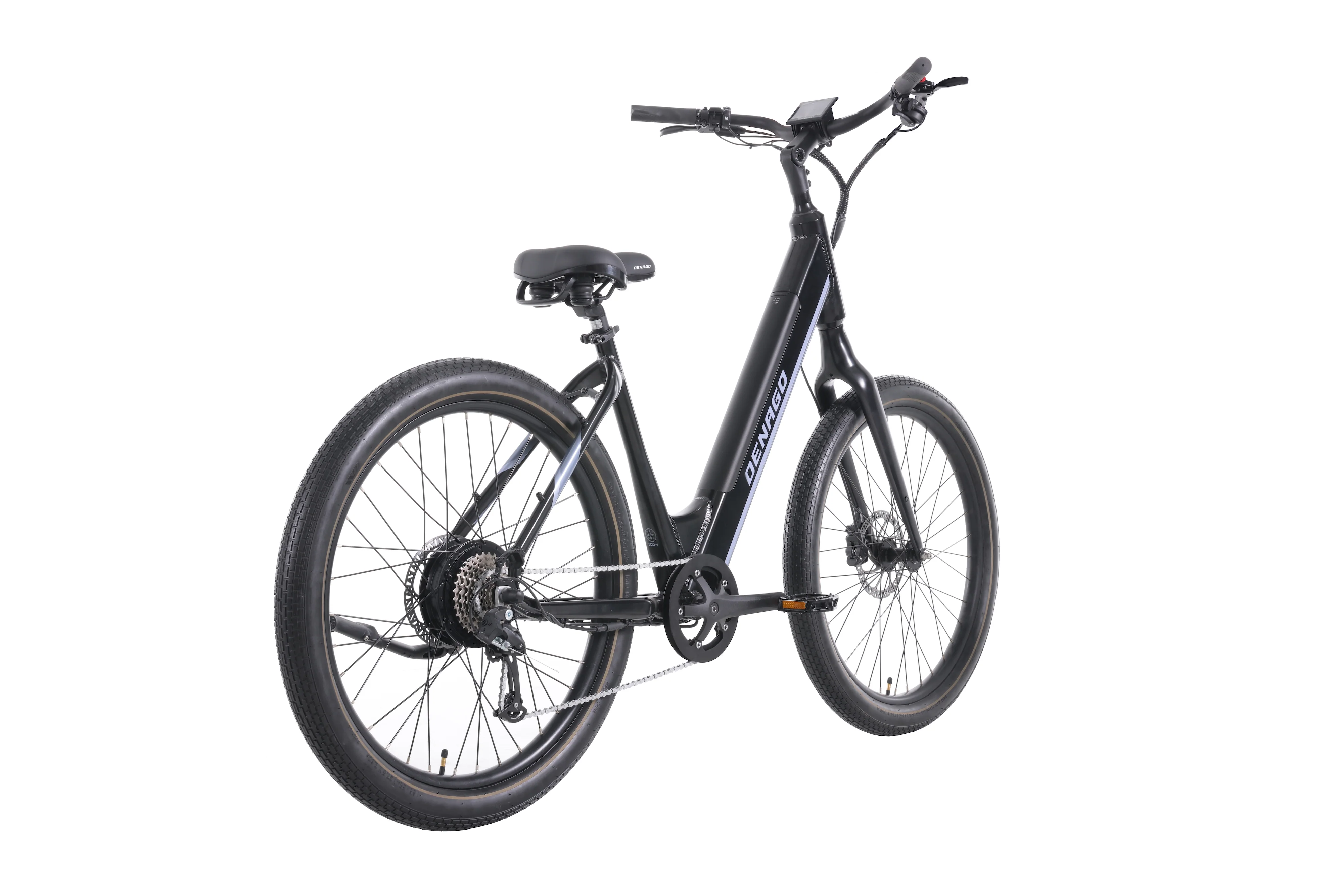 Denago's City Model 2 eBike in step-thru frame style, ideal for riders with short inseams or poor flexibility. The step-thru frame makes it easy to start and stop. The sequel to Denago's award-winning City Model 1 now includes wider tires, integrated battery, and 8 speed drivetrain.
