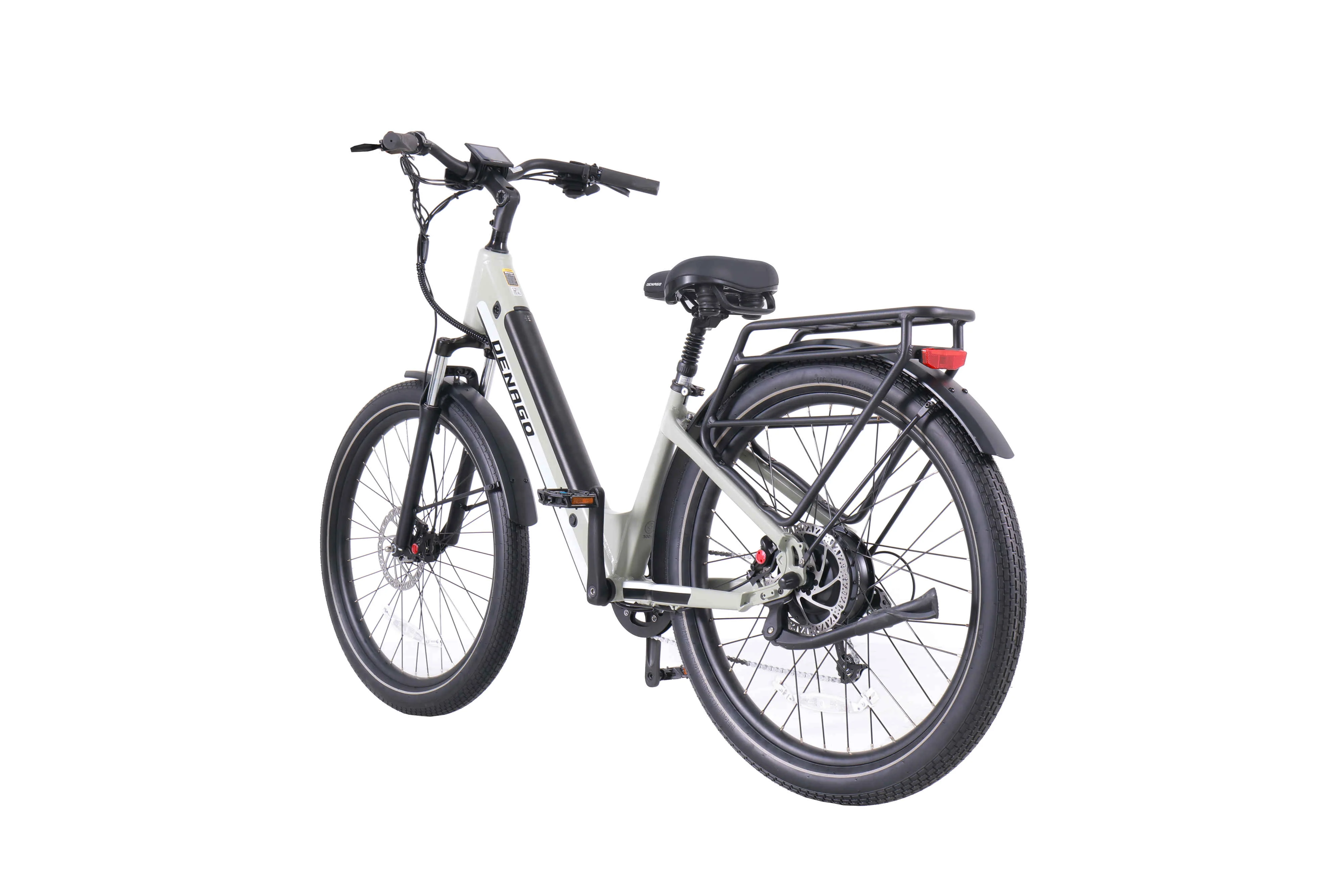 The Denago Commute Model 1 is an urban eBike with a step-thru frame with a low standover height - easy to mount and dismount for shorter riders or those with poor flexibility or injuries. Commute Model 1 is full-featured with a suspension fork and seatpost, integrated headlight, plus included fenders, rear rack, and kickstand. Stealthy, sleek battery integrated with the down tube.